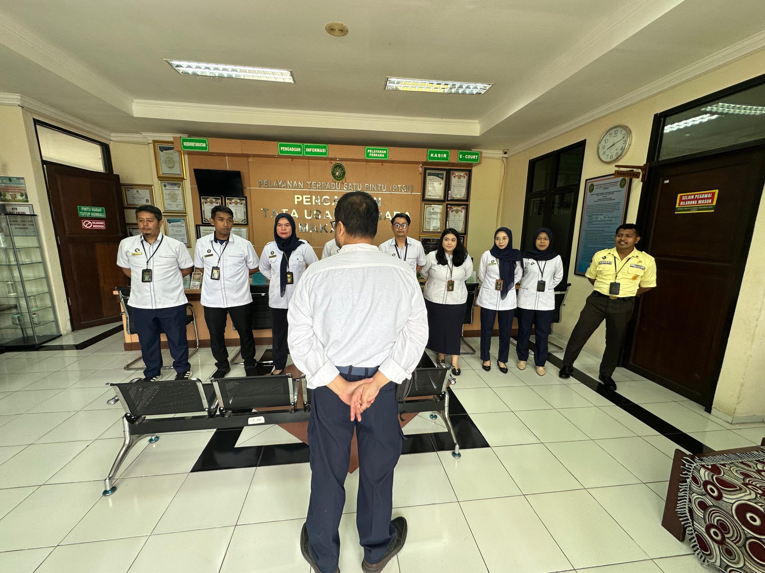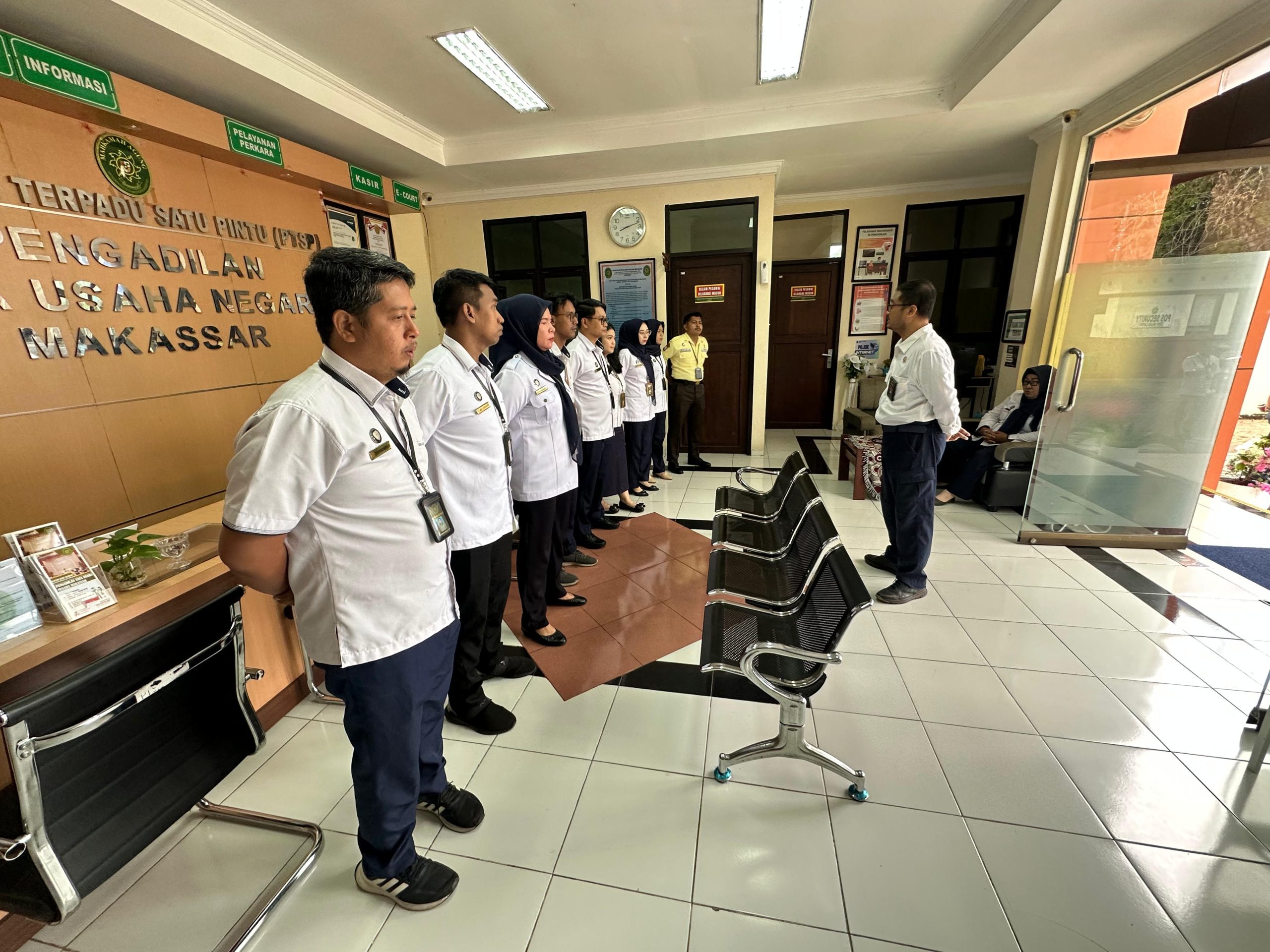Briefing Pagi Petugas Pelayanan Terpadu Satu Pintu dipimpin oleh Hakim Pengawas Bidang PTSP PTUN Makassar Bapak Christian Edni Putra, S.H.