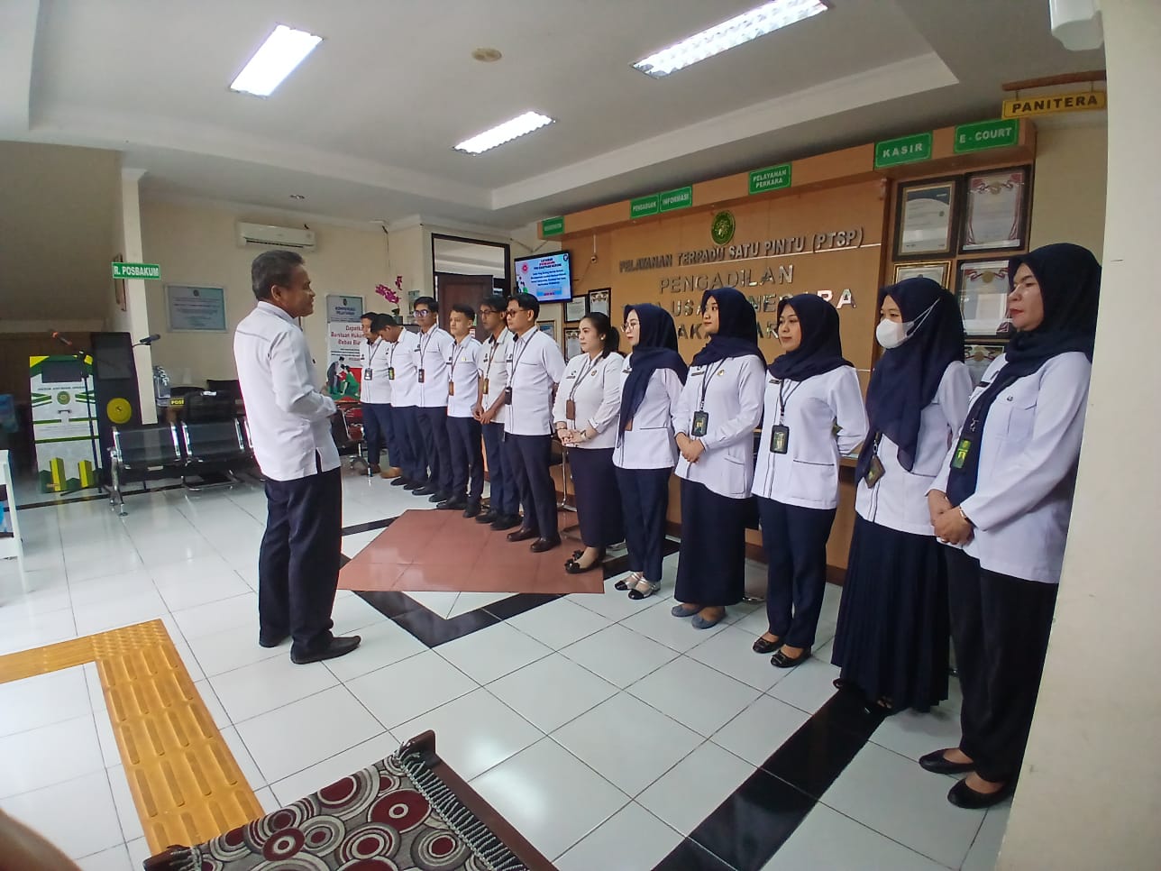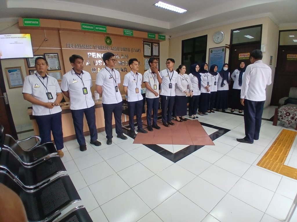 Dalam rangka meningkatkan kualitas pelayanan publik, PTUN Makassar melaksanakan Briefing Pagi Petugas Pelayanan Terpadu Satu Pintu (PTSP). Kegiatan ini dilaksanakan sebagai bentuk penguatan disiplin, koordinasi, dan kesiapan petugas dalam memberikan pelayanan kepada masyarakat pencari keadilan.