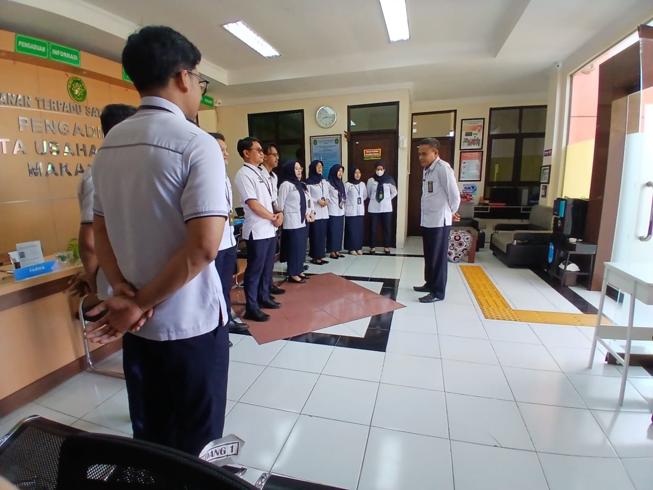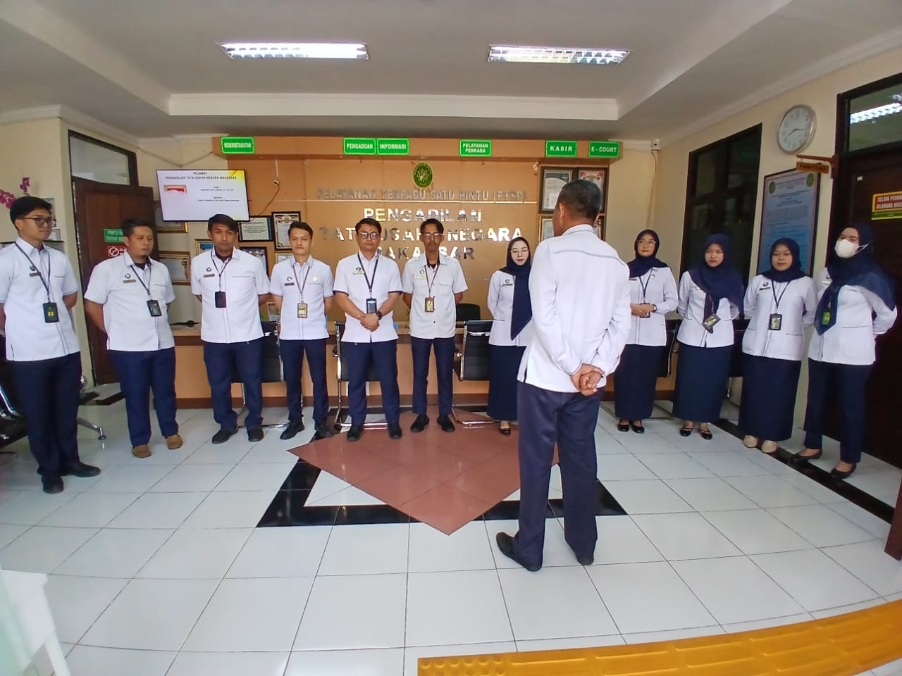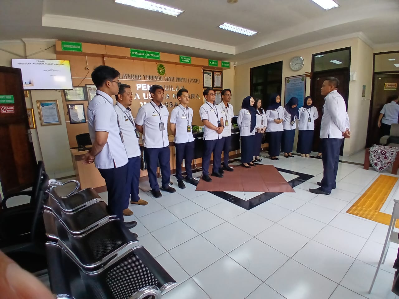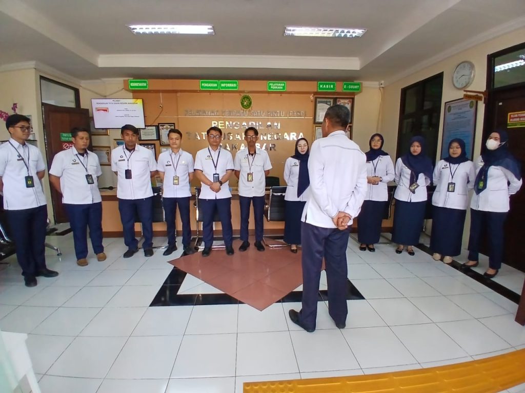 Dalam rangka meningkatkan kualitas pelayanan publik, PTUN Makassar melaksanakan Briefing Pagi Petugas Pelayanan Terpadu Satu Pintu (PTSP). Kegiatan ini dilaksanakan sebagai bentuk penguatan disiplin, koordinasi, dan kesiapan petugas dalam memberikan pelayanan kepada masyarakat pencari keadilan.