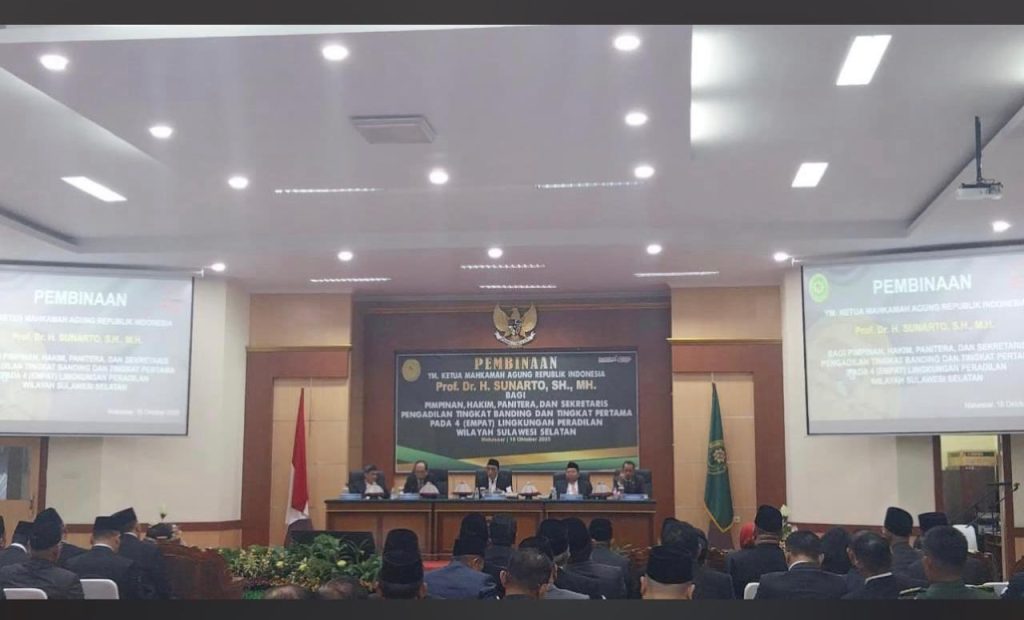 Pembinaan YM. Ketua Mahkamah Agung RI Prof. Dr. H. Sunarto, SH.,MH. Bagi Pimpinan, hakim, Panitera, dan Sekretaris Pengadilan Tingkat banding dan Tingkat Pertama Pada 4 (Empat) Lingkungan Peradilan Wilayah Sulawesi Selatan Bertempat di Ruang Prof. Dr. H.M. Hatta Ali, S.H.,M.H. Aula Lt. II Pengadilan Tinggi Makassar dihadiri oleh Ketua PTUN Makassar Bapak Fajar Wahyu Jatmiko, S.H., Panitera PTUN Makassar Bapak Abdul Kadir, S.Ag.,S.H.,M.H., Sekretaris PTUN Makassar Ibu Sri Muliati, S.Sos.,M.H.