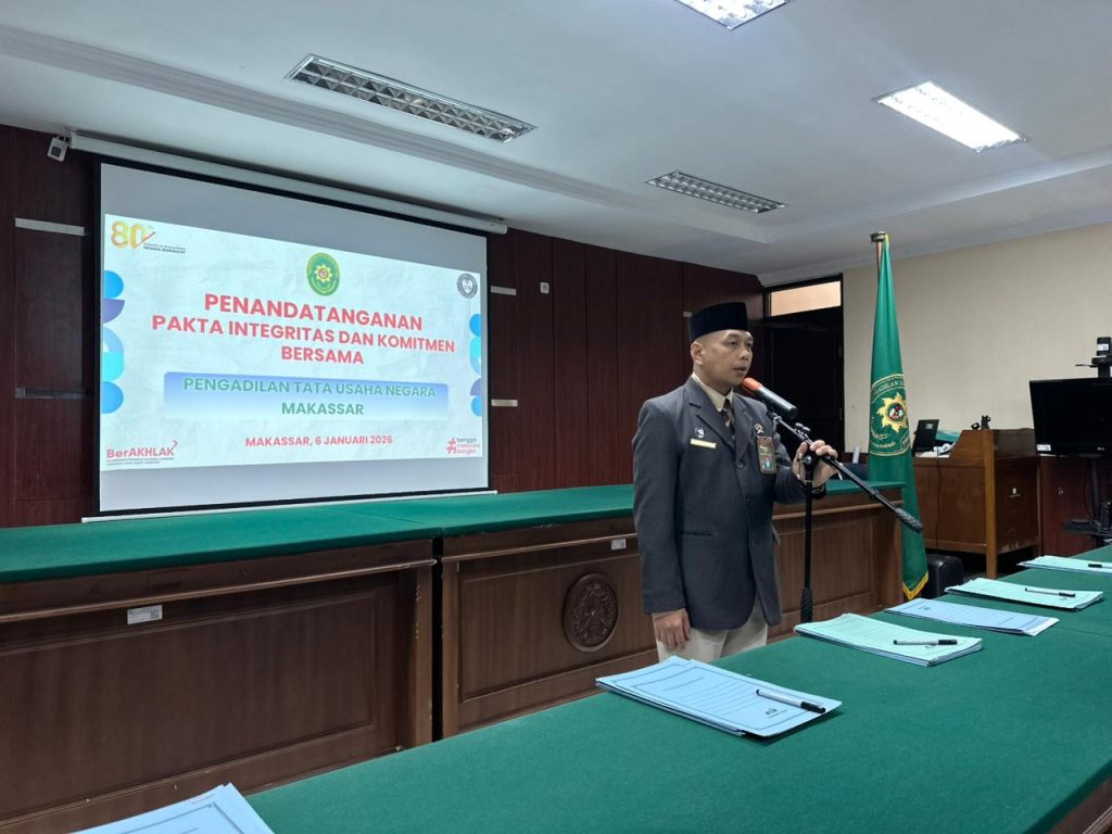 Pengadilan Tata Usaha Negara (PTUN) Makassar melaksanakan kegiatan Penandatanganan Pakta Integritas, Perjanjian Kinerja, dan Komitmen Bersama sebagai wujud penguatan integritas, akuntabilitas, serta komitmen seluruh aparatur dalam menjalankan tugas dan fungsi peradilan.