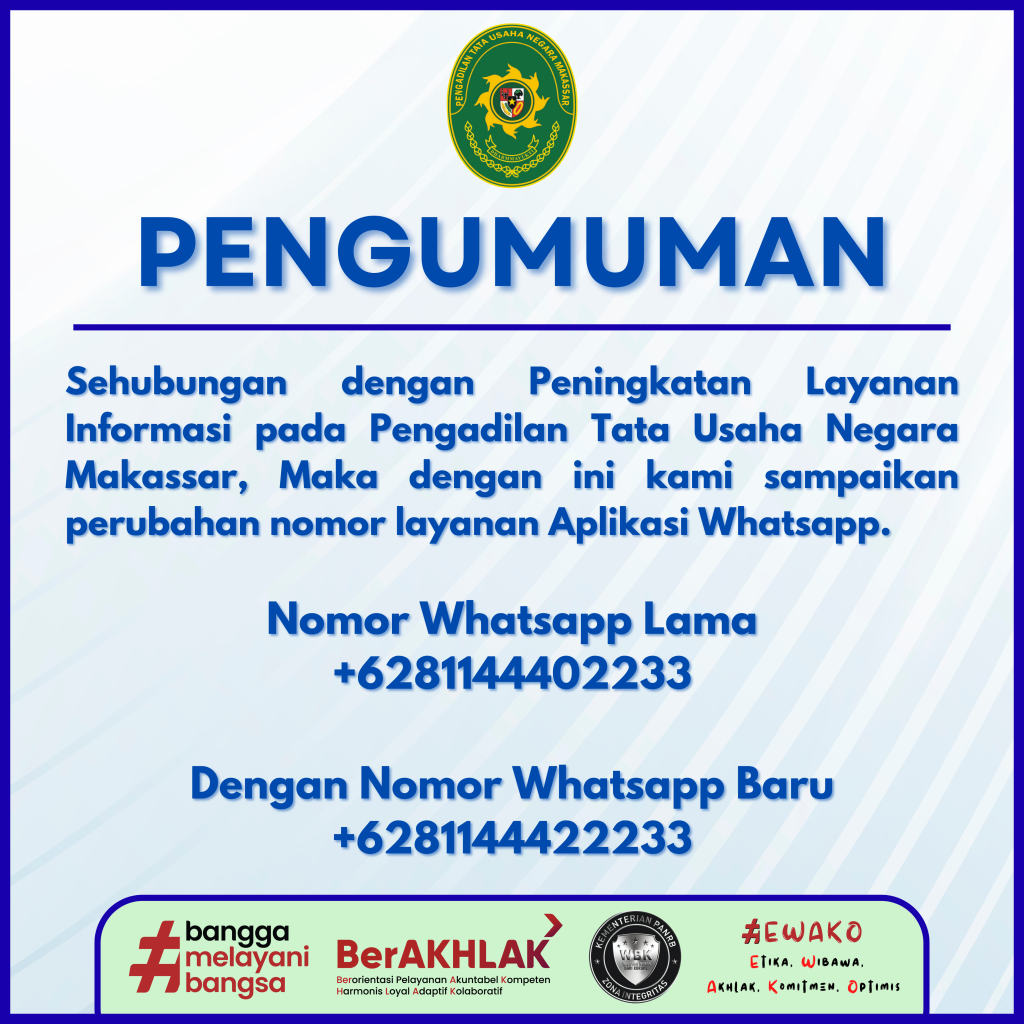 Pengumuman Pergantian Nomor Layanan Aplikasi Whatsapp Pengadilan Tata Usaha Negara Makassar
