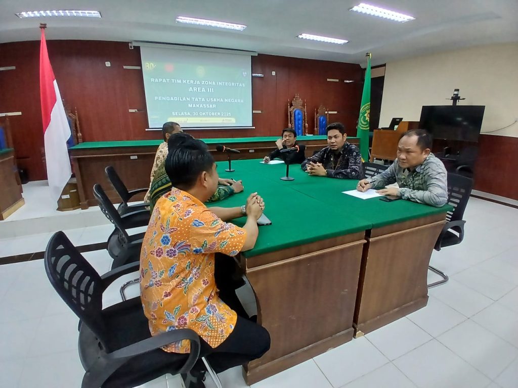 Rapat monev (monitoring dan evaluasi) Area III Zona Integritas (ZI) menuju Wilayah Birokrasi Bersih dan Melayani (WBBM) dilaksanakan diruang sidang Cakra PTUN Makassar, Rapat dipimpin Oleh Ketua Tim Koordinator Area III Bapak Ceckly Jembly Kereh, S.H. Dan dihadiri oleh Seluruh Tim Area III Zona Integritas.