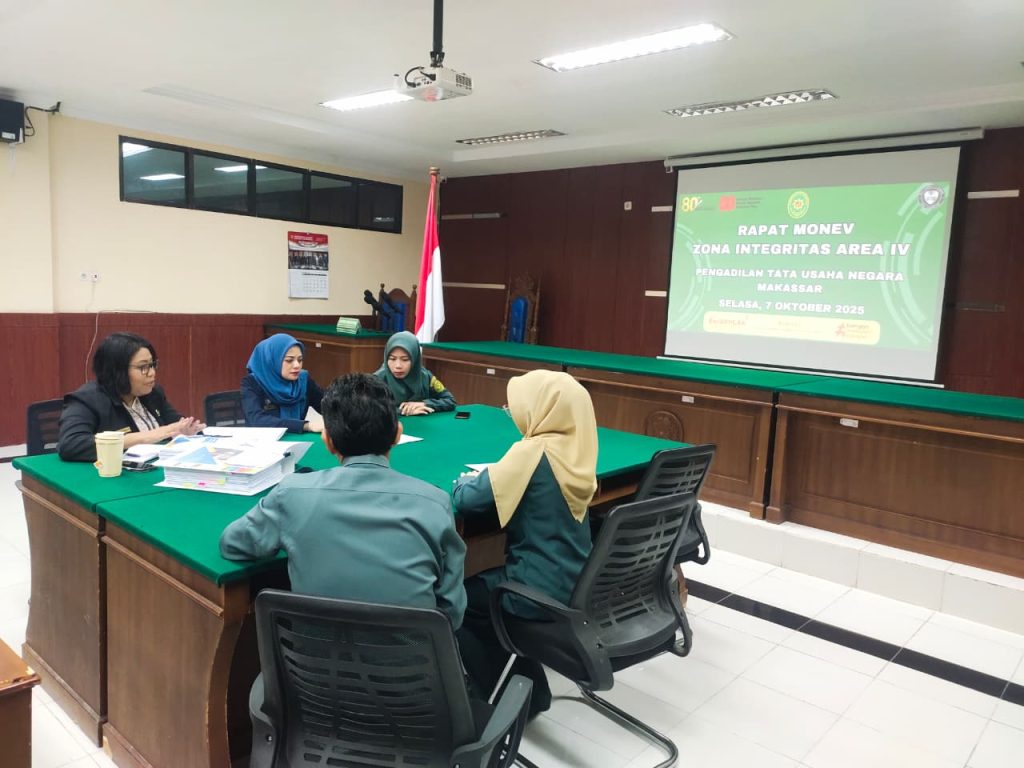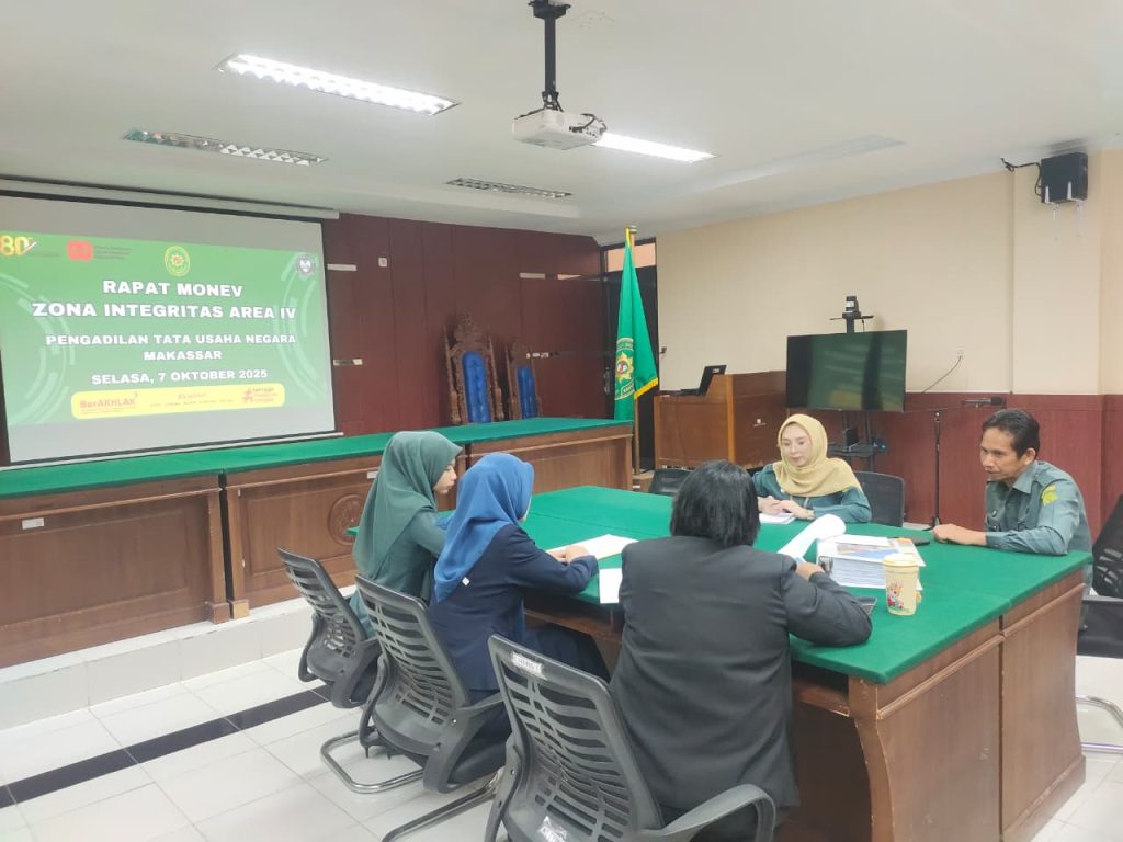 Rapat monev (monitoring dan evaluasi) Area IV Zona Integritas (ZI) menuju Wilayah Birokrasi Bersih dan Melayani (WBBM) dilaksanakan diruang sidang Cakra PTUN Makassar, Rapat dipimpin Oleh Ketua Tim Koordinator Area IV Ibu Sanny Pattipeilohy, S.H, M.H. Dan dihadiri oleh Seluruh Anggota Tim Area IV Zona Integritas.