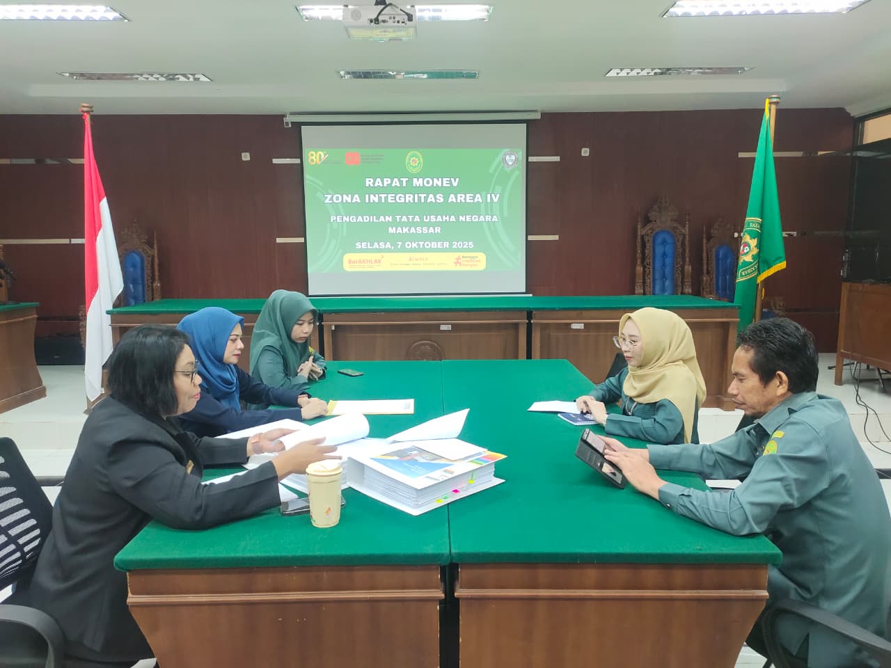 Rapat monev (monitoring dan evaluasi) Area IV Zona Integritas (ZI) menuju Wilayah Birokrasi Bersih dan Melayani (WBBM) dilaksanakan diruang sidang Cakra PTUN Makassar, Rapat dipimpin Oleh Ketua Tim Koordinator Area IV Ibu Sanny Pattipeilohy, S.H, M.H. Dan dihadiri oleh Seluruh Anggota Tim Area IV Zona Integritas.