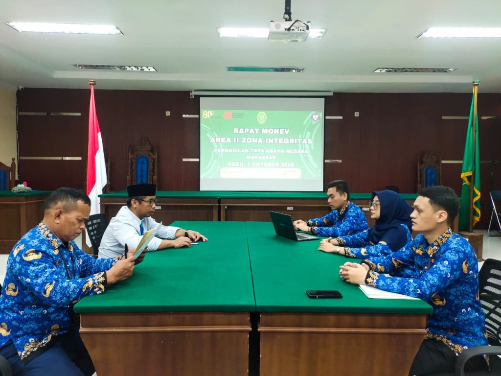 Rapat monev (monitoring dan evaluasi) Area II Zona Integritas (ZI) menuju Wilayah Birokrasi Bersih dan Melayani (WBBM) dilaksanakan diruang sidang Cakra PTUN Makassar, Rapat dipimpin Oleh Ketua Tim Koordinator Area II Bapak Lutfi, S.H. Dan dihadiri oleh Seluruh Tim Area II Zona Integritas.