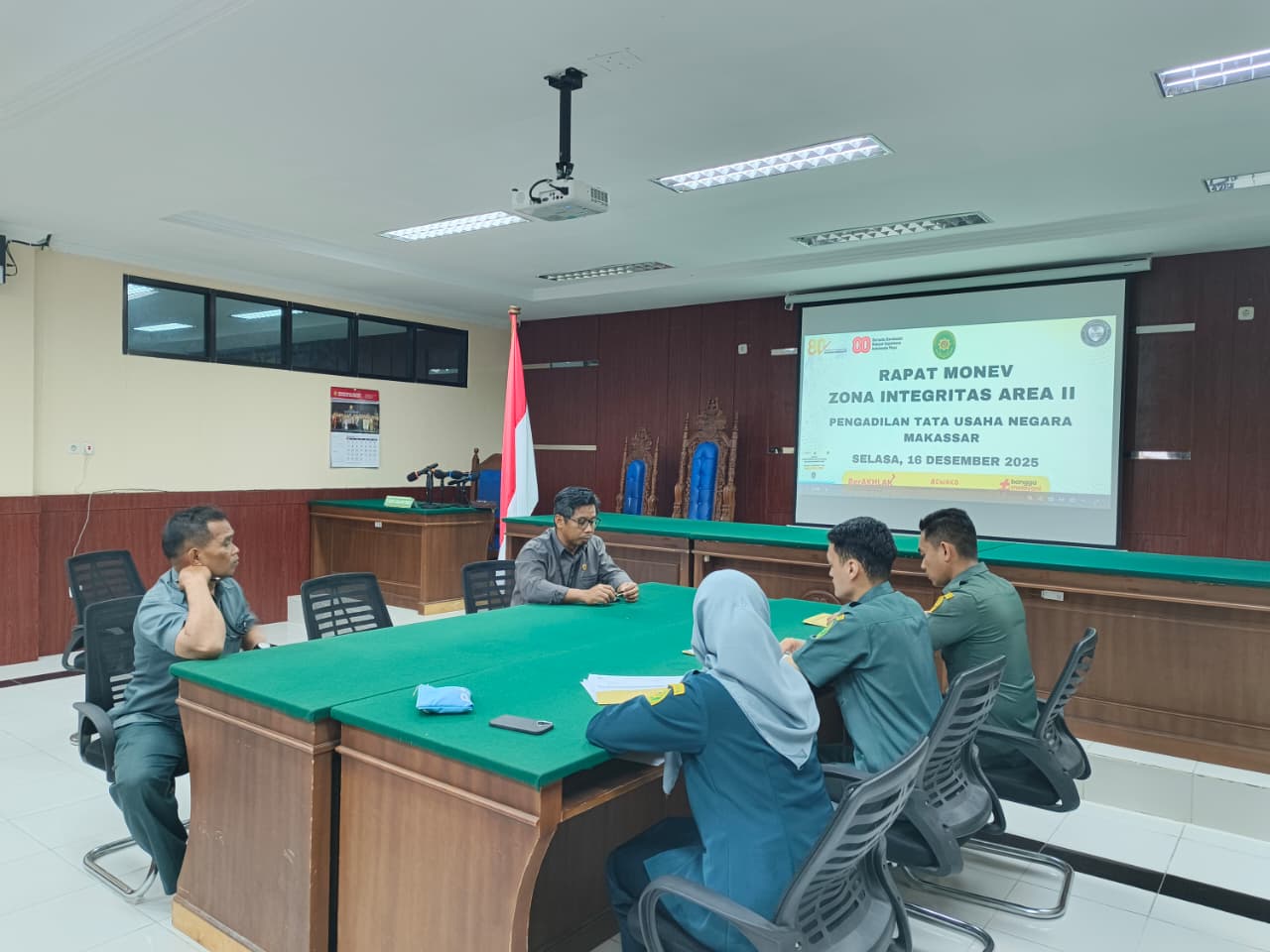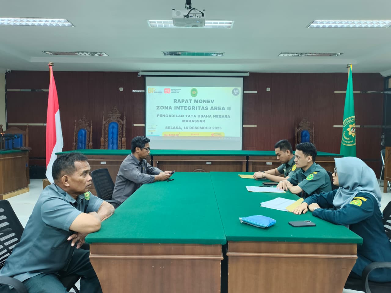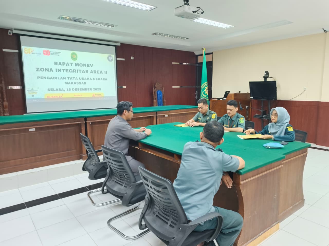 Rapat monev (monitoring dan evaluasi) Area II Zona Integritas (ZI) menuju Wilayah Birokrasi Bersih dan Melayani (WBBM) dilaksanakan diruang sidang Cakra PTUN Makassar, Rapat dipimpin Oleh Ketua Tim Koordinator Area II Bapak Lutfi, S.H. Dan dihadiri oleh Seluruh Tim Area II Zona Integritas.