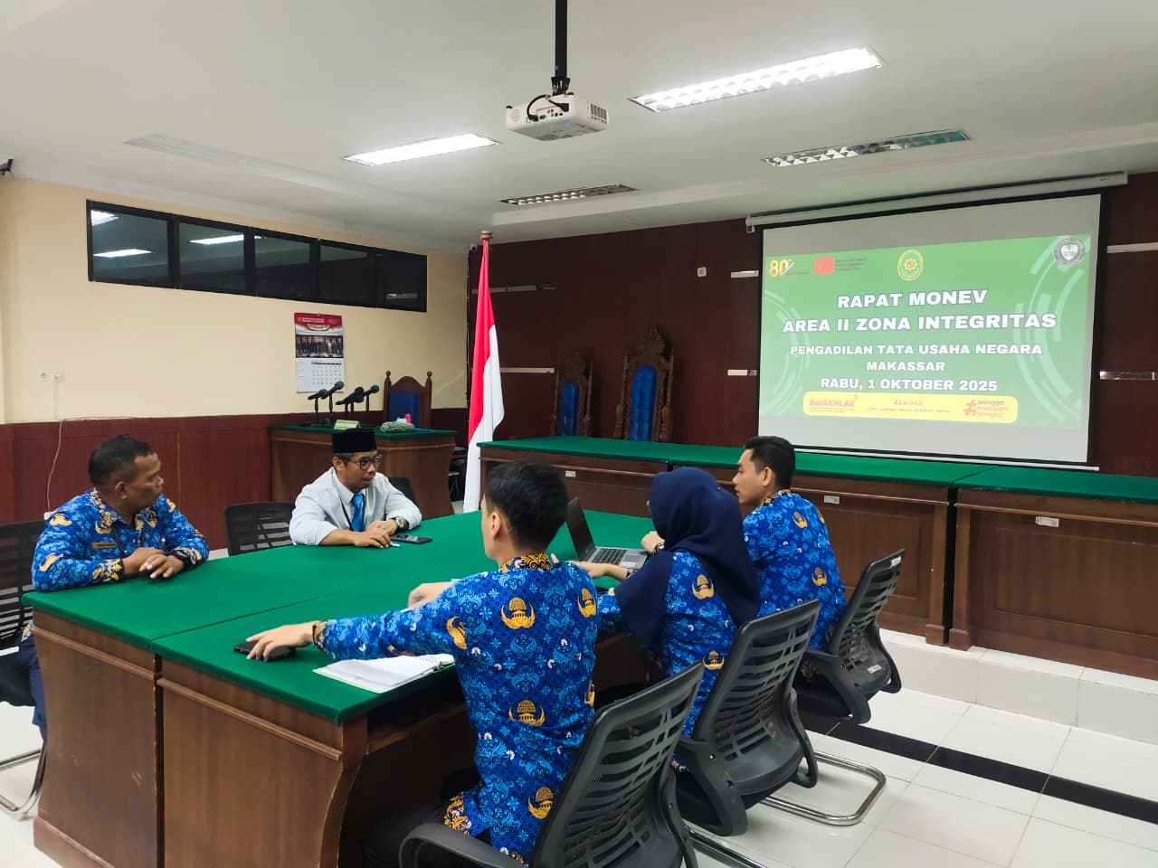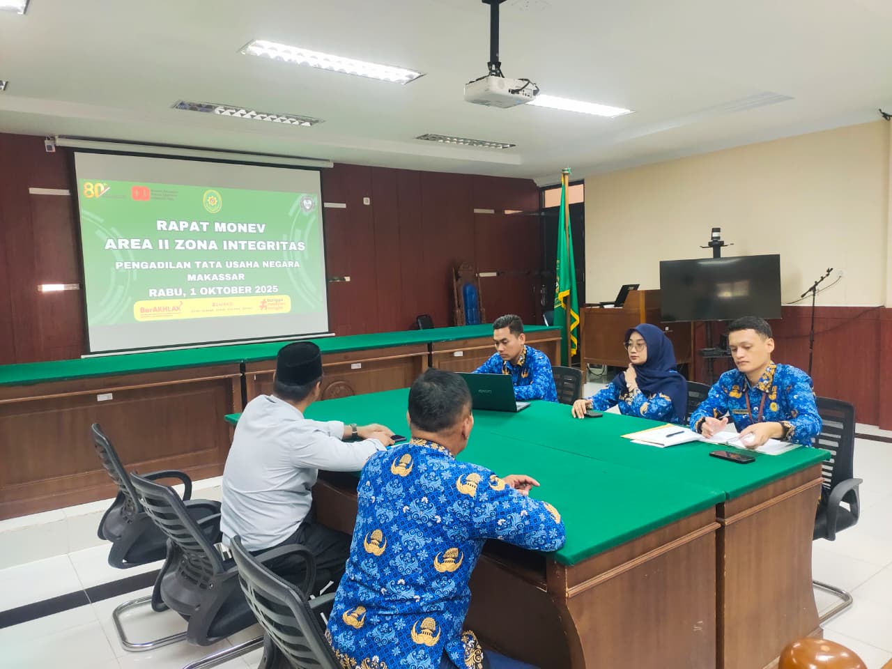 Rapat monev (monitoring dan evaluasi) Area II Zona Integritas (ZI) menuju Wilayah Birokrasi Bersih dan Melayani (WBBM) dilaksanakan diruang sidang Cakra PTUN Makassar, Rapat dipimpin Oleh Ketua Tim Koordinator Area II Bapak Lutfi, S.H. Dan dihadiri oleh Seluruh Tim Area II Zona Integritas.