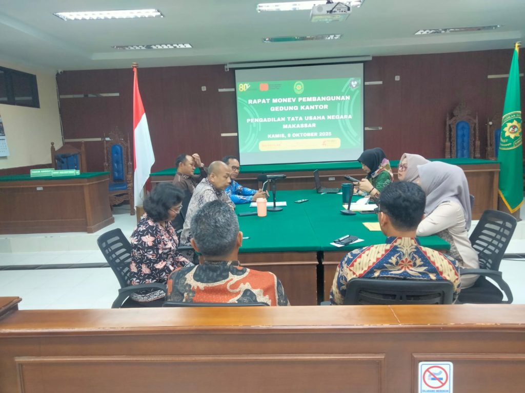 Kegiatan Rapat Monev Pembangunan Gedung Kantor PTUN Makassar diruang sidang Cakra PTUN Makassar di pimpin oleh Ketua PTUN Makassar Bapak Fajar Wahyu Jatmiko, S.H. di dampingi oleh Wakil Ketua PTUN Makassar Bapak Muhammad Ilham, S.H.,M.H. dihadiri Oleh Tim Pengawas Internal PTUN Makassar, Sekretaris PTUN Makassar Ibu Sri Muliati, S.Sos.,M.H. dan Pejabat Pembuat Komitmen (PPK) PTUN Makassar Ibu Amy Amelia Haris, S.E.