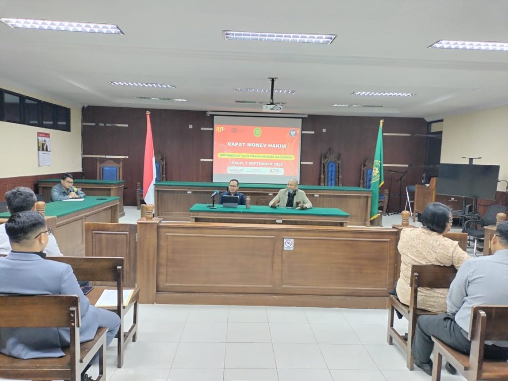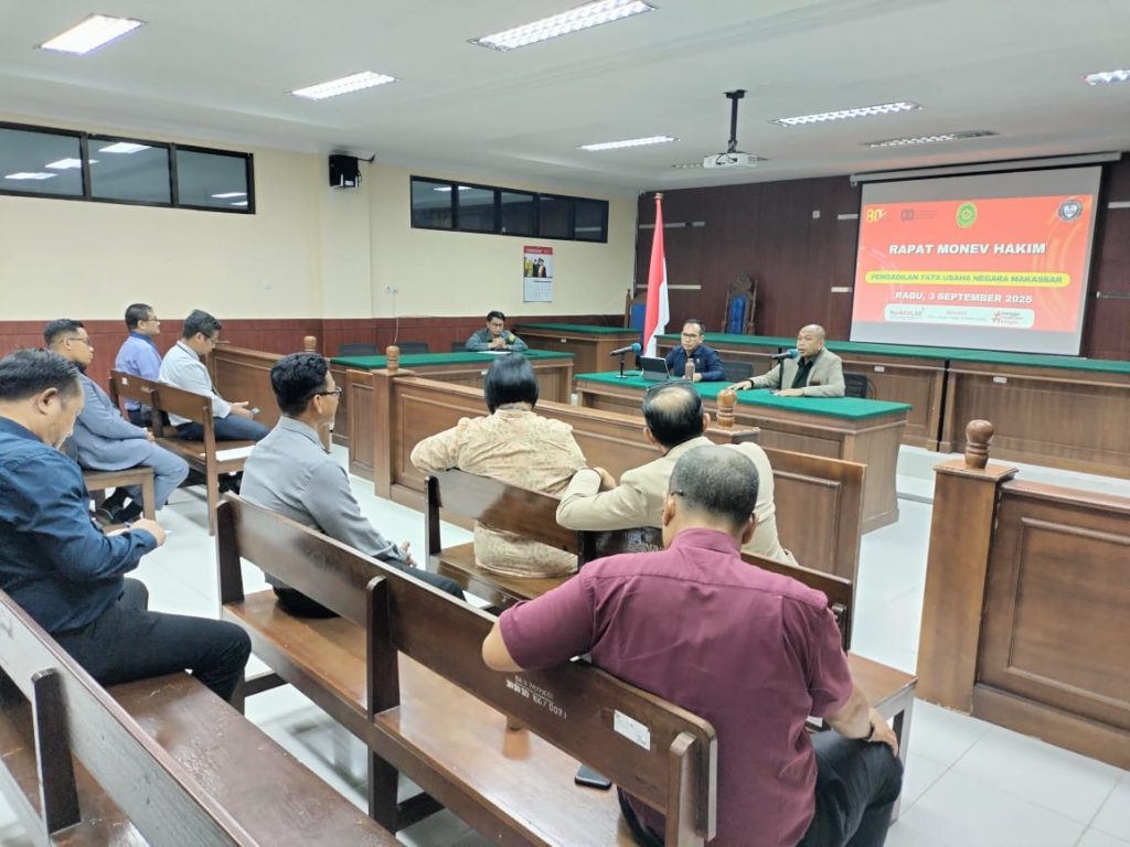 Rapat Monitoring dan Evaluasi Hakim PTUN Makassar yang dipimpin oleh Ketua PTUN Makassar diruang sidang cakra PTUN Makassar.