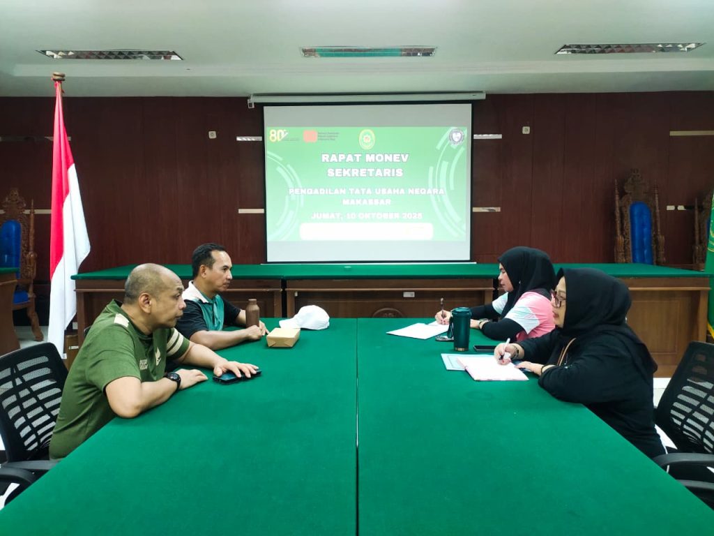Rapat Monitoring dan Evaluasi Sekretaris Pengadilan Tata Usaha Negara Makassar dipimpin oleh Ketua PTUN Makassar Bapak Fajar Wahyu Jatmiko, S.H. dan Wakil ketua PTUN Makassar Bapak Muhamad Ilham, S.H.,M.H. diruang sidang Candra PTUN Makassar.