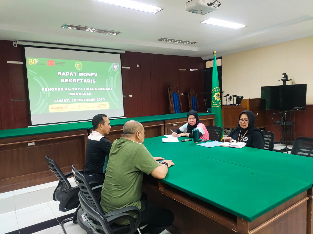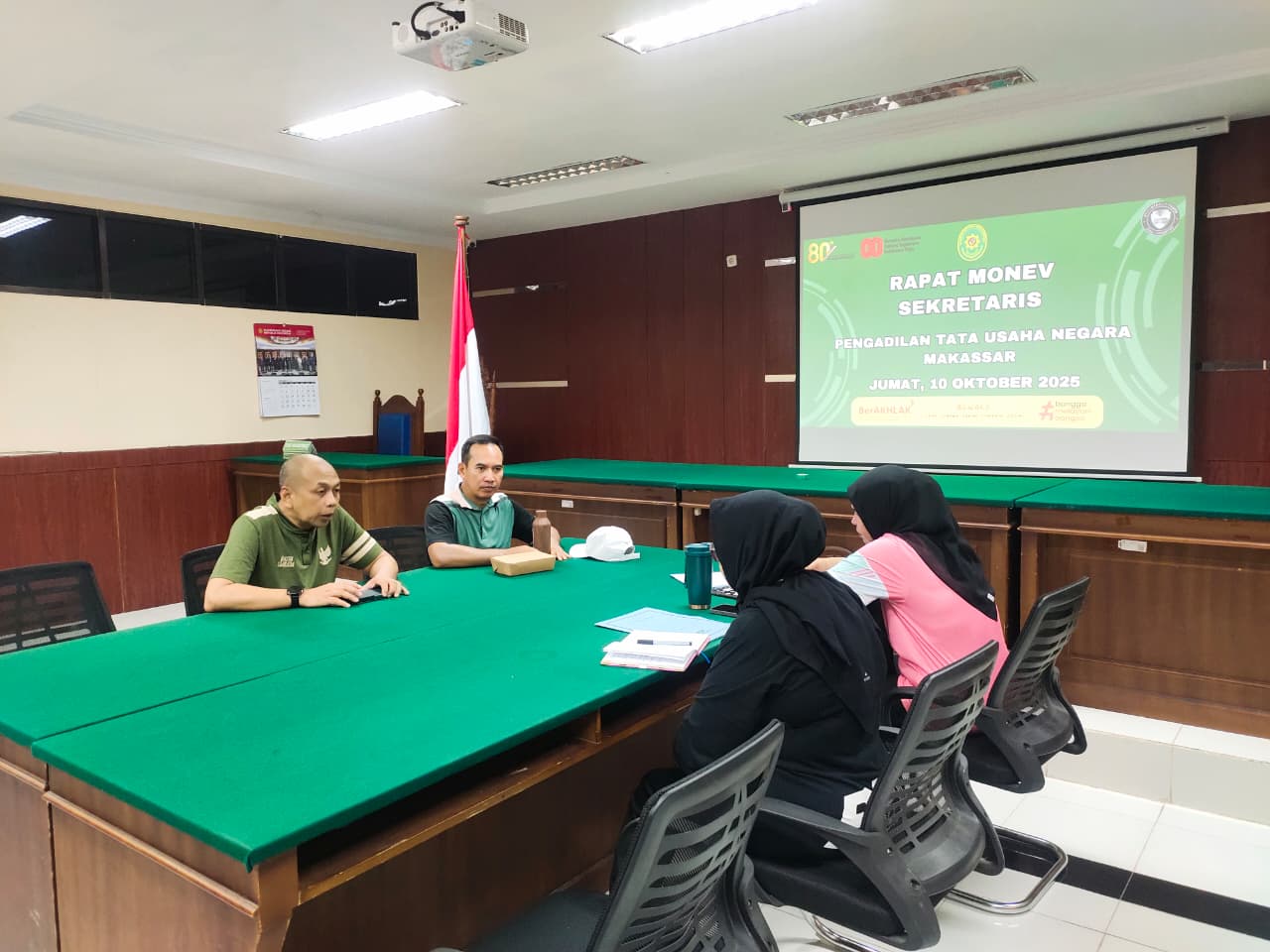 Rapat Monitoring dan Evaluasi Sekretaris Pengadilan Tata Usaha Negara Makassar dipimpin oleh Ketua PTUN Makassar Bapak Fajar Wahyu Jatmiko, S.H. dan Wakil ketua PTUN Makassar Bapak Muhamad Ilham, S.H.,M.H. diruang sidang Candra PTUN Makassar.