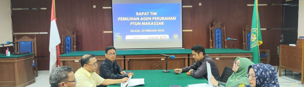 Beranda / Pengumuman / Rapat Tim Pemilihan Agen Perubahan Pengadilan Tata Usaha Negara MakassarPengumumanRapat Tim Pemilihan Agen Perubahan Pengadilan Tata Usaha Negara Makassar25 Februari 2025 Selasa, 25 Februari 2025 Kegiatan Rapat Tim Pemilihan Agen Perubahan Pengadilan Tata Usaha Negara Makassar Tahun 2025 dilaksanakan di Ruang Sidang Cakra. Share this ArticlePrevious ArticleBriefing Pagi Petugas Sidang PTUN MakassarNext ArticleRapat Kepaniteraan Bulan Februari 2025 Related Posts Rapat Koordinasi Langkah-Langkah Pelaksanaan Anggaran Tahun 2026 2 Maret 2026 Briefing Pagi Petugas Pelayanan Terpadu Satu Pintu (PTSP) PTUN Ma ... 2 Maret 2026 Apel Pagi Pengadilan Tata Usaha Negara Makassar 2 Maret 2026 Tinggalkan Balasan Batalkan balasanAlamat email Anda tidak akan dipublikasikan. Ruas yang wajib ditandai *KomentarNama * Email * Situs Web Δ Situs ini menggunakan Akismet untuk mengurangi spam. Pelajari bagaimana data komentar Anda diproses