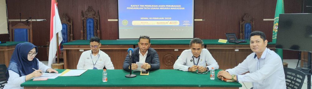 Beranda / Pengumuman / Rapat Tim Pemilihan Agen Perubahan PTUN Makassar Tahun 2025PengumumanRapat Tim Pemilihan Agen Perubahan PTUN Makassar Tahun 202510 Februari 2025 Senin, 10 Februari 2025 Rapat Tim Pemilihan Agen Perubahan PTUN Makassar Tahun 2025 dipimpin oleh Ketua Tim Pemilihan Agen Perubahan Bapak Dr. Andi Muh Ali Rahman, S.H., M.H. Share this ArticlePrevious ArticlePenerimaan Mahasiswa Magang Universitas Bosowa dan Universitas HasanuddinNext ArticleRapat Tim Kerja Zona Integritas Area V Related Posts Rapat Koordinasi Langkah-Langkah Pelaksanaan Anggaran Tahun 2026 2 Maret 2026 Briefing Pagi Petugas Pelayanan Terpadu Satu Pintu (PTSP) PTUN Ma ... 2 Maret 2026 Apel Pagi Pengadilan Tata Usaha Negara Makassar 2 Maret 2026 Tinggalkan Balasan Batalkan balasanAlamat email Anda tidak akan dipublikasikan. Ruas yang wajib ditandai *KomentarNama * Email * Situs Web Δ Situs ini menggunakan Akismet untuk mengurangi spam. Pelajari bagaimana data komentar Anda diproses