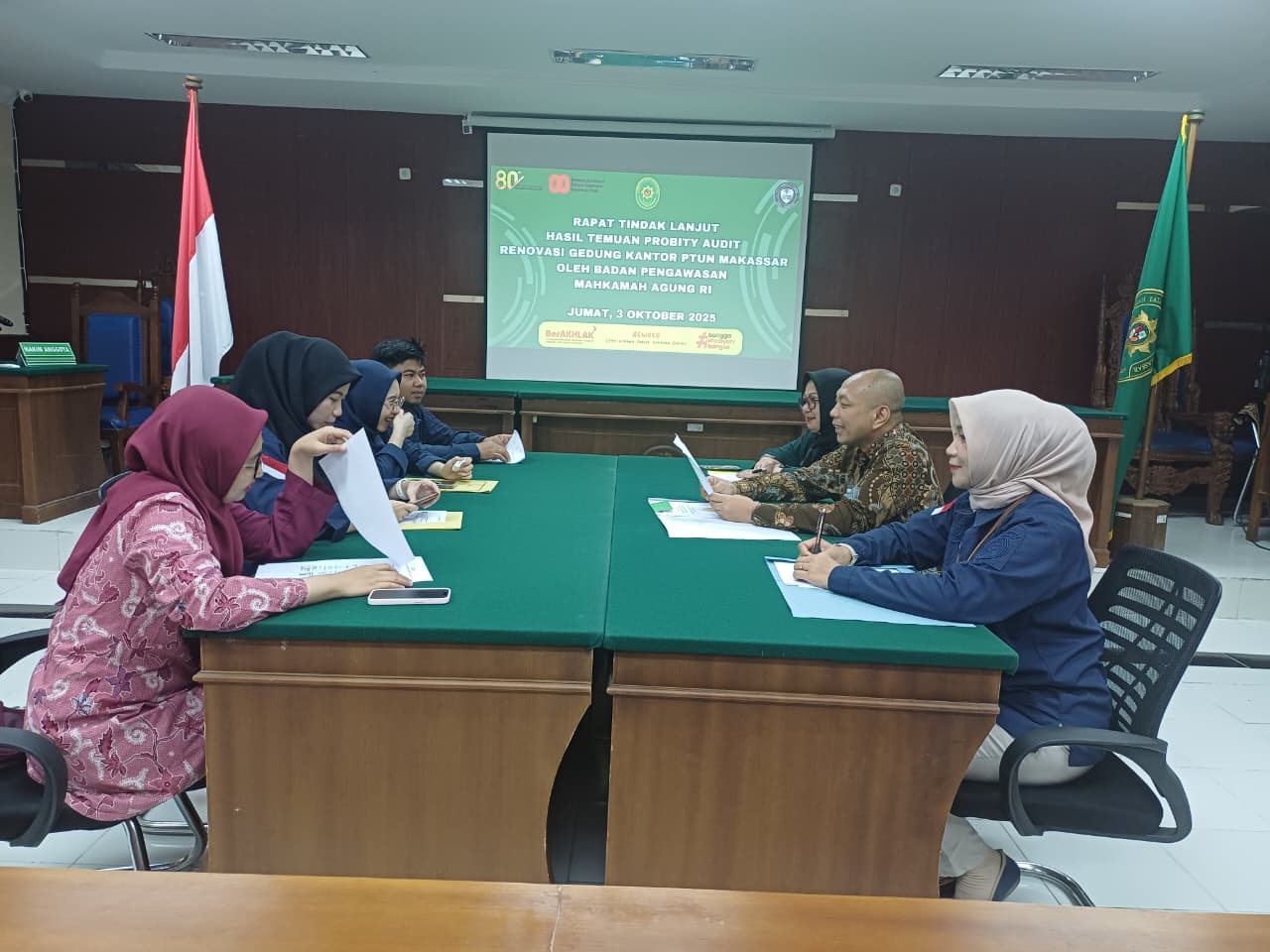 Rapat ini Membahas Tindak Lanjut Hasil Temuan Probity Audit Renovasi Gedung Kantor PTUN Makassar Oleh Badan Pengawas (Bawas) Mahkamah Agung Republik Indonesia yang telah Melaksanakan Pengawasan di PTUN Makassar