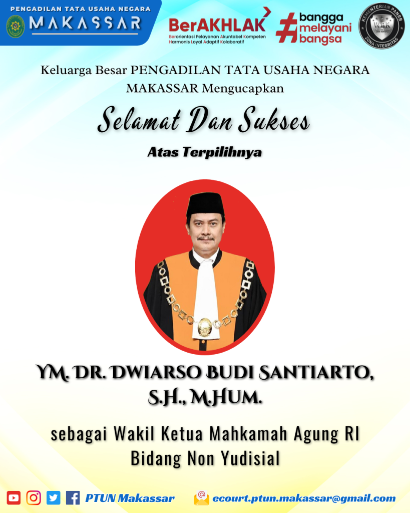 Keluarga Besar Pengadilan Tata Usaha Negara Makassar mengucapkan Selamat dan Sukses kepada Yang Mulia Dr. Dwiarso Budi Santiarto, S.H., M.Hum. atas terpilihnya sebagai Wakil Ketua Mahkamah Agung RI Bidang Non Yudisial.