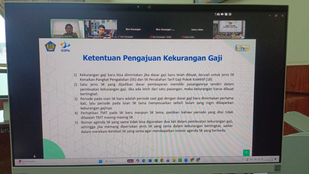 Pengadilan Tata Usaha Negara (PTUN) Makassar mengikuti Sosialisasi Revisi Anggaran dan Petunjuk Teknis Pembayaran Gaji Hakim yang dilaksanakan secara daring melalui Zoom Meeting. Kegiatan tersebut diikuti oleh Sekretaris PTUN Makassar Ibu Sri Muliati, S.Sos.,M.H. Kasubag Umum dan Keuangan Bapak Ariyanto, dan Staf Umum dan Keuangan Bapak Muqaddarul Khair Madjidi, S.T.
