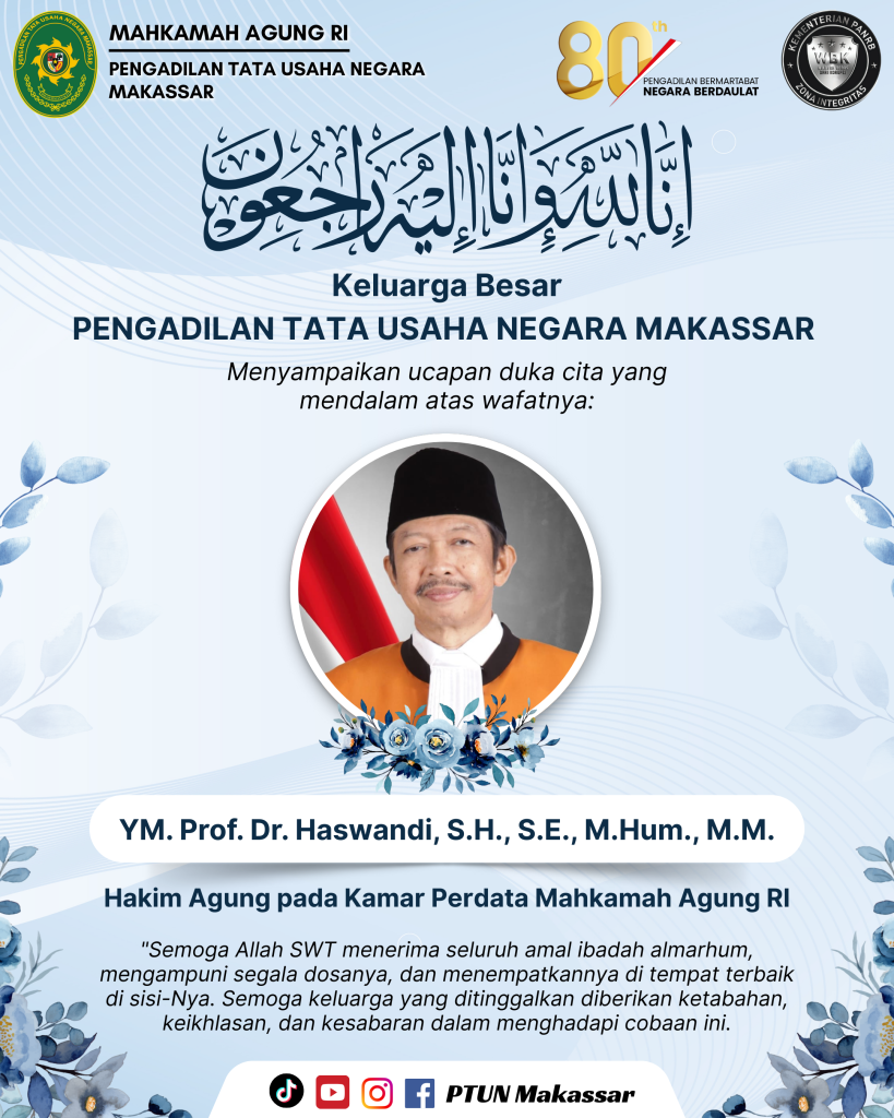 Innalillahi wa inna ilaihi raji’un. keluarga besar Pengadilan Tata Usaha Negara Makassar Menyampaikan ucapan duka cita yang mendalam atas wafatnya, YM. Prof. Dr. Haswandi, S.H., S.E., M.Hum., M.M. Hakim Agung pada Kamar Perdata Mahkamah Agung RI, Pada hari Selasa, 16 Desember 2025.