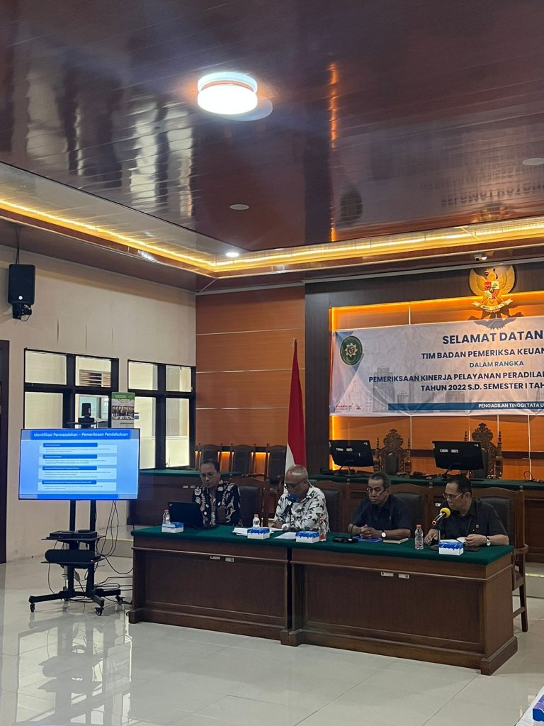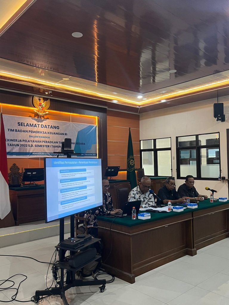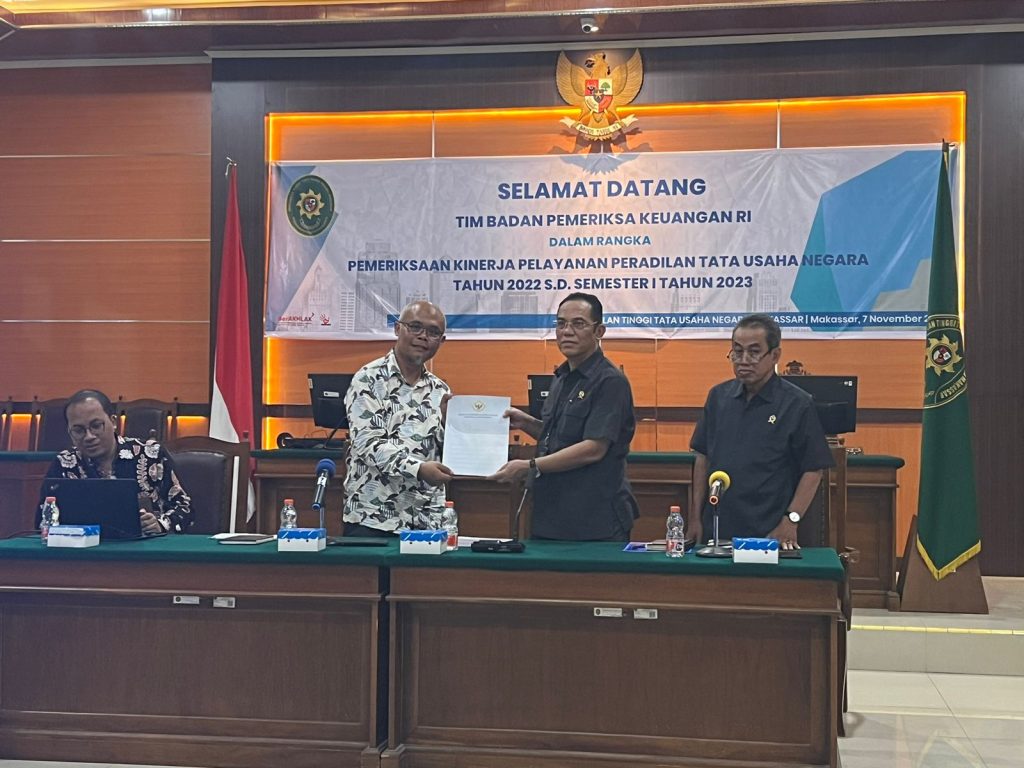 Kegiatan Entry Meeting Pemeriksaan Kinerja oleh Badan Pemeriksaan Keuangan Republik Indonesia dalam rangka Pemeriksaan Kinerja Pelayanan Peradilan Tata Usaha Negara Tahun 2022 sampai dengan Semester I Tahun 2023 dihadiri oleh Ketua PTUN Makassar Bapak Tedi Romyadi, S.H., M.H., Sekretaris Ibu Sri Muliati, S.Sos., M.H, Panitera Bapak Hulul, S.H, Panitera Muda Perkara Bapak Parulian Simarmata, S.H., M.H. dan Panitera Muda Hukum Bapak Burhan S.H., M.H. Pelaksanaan kegiatan ini bertempat di Ruang Sidang Pengadilan Tinggi Tata Usaha Negara Makassar.